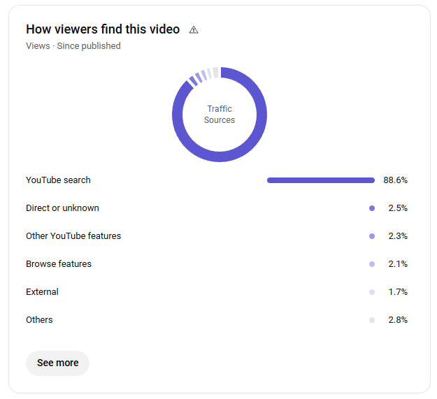 Circling back to my infamous “Anime Sucks” video, the analytics there tell an interesting story. The vast, vast majority of views on that video have come directly from YouTube search. It’s not the algorithm pushing my video (outside of showing it higher up in the search results).