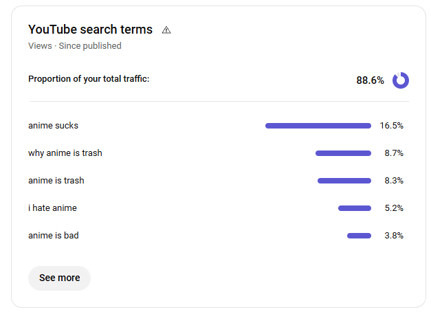 57% of people (who actually use the like/dislike buttons on YouTube) agree with the premise that anime sucks and give me a like to signify that. But if most people are coming to the video from YouTube search, and most of them are looking up something along the lines of “anime sucks”, then that means a good percentage of the people are just hate-watching the video so that they can dislike it and leave a comment telling me I’m an idiot for hating anime. They, as anime fans, are searching “anime sucks” just to get angry.